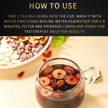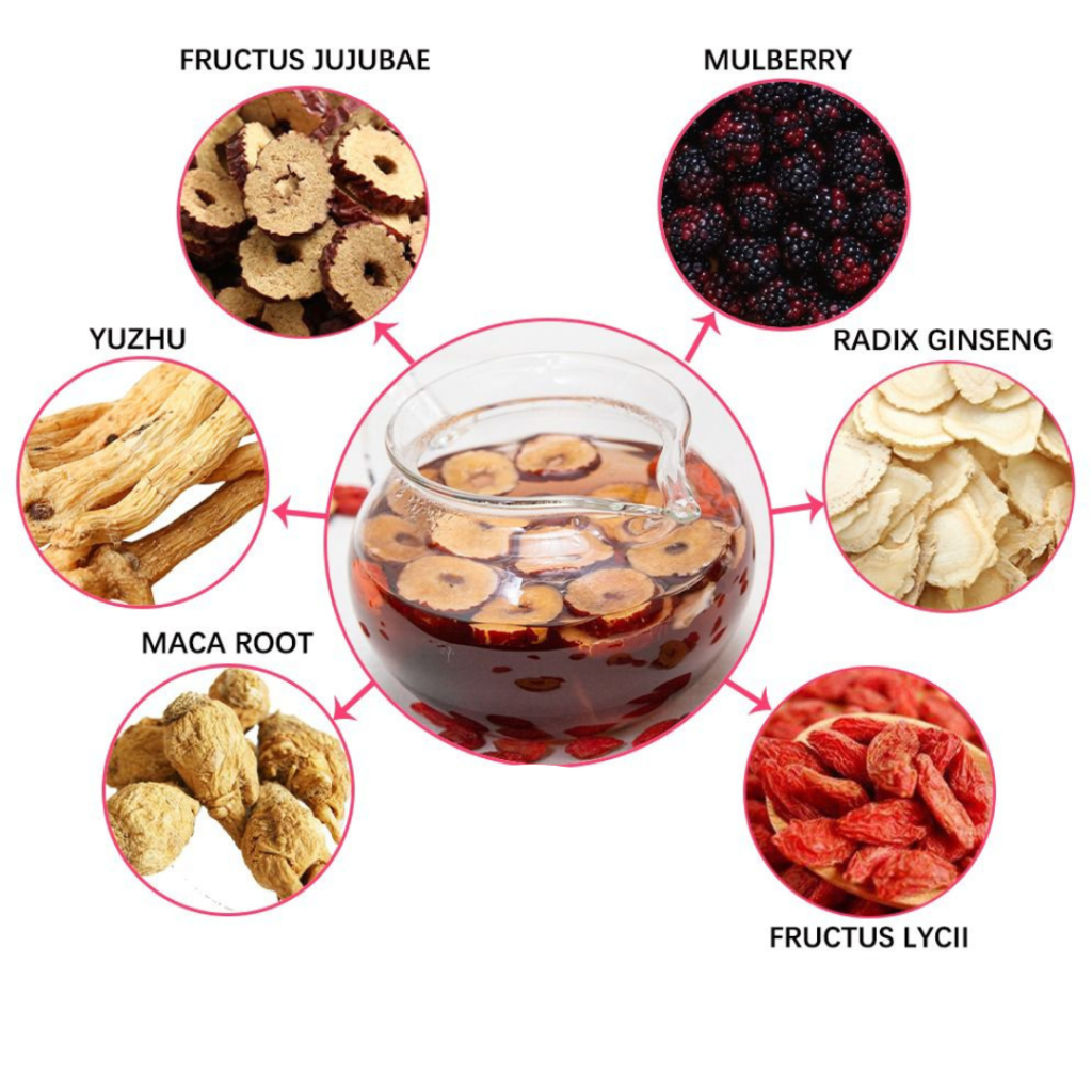 The natural ingredients in the tea include Maca Root, Radix Ginseng, Mulberry, Fructus Jujube (a type of red date), and Rhizoma Polygonati. These are ingredients that can enhance reproduction and your sexual health.