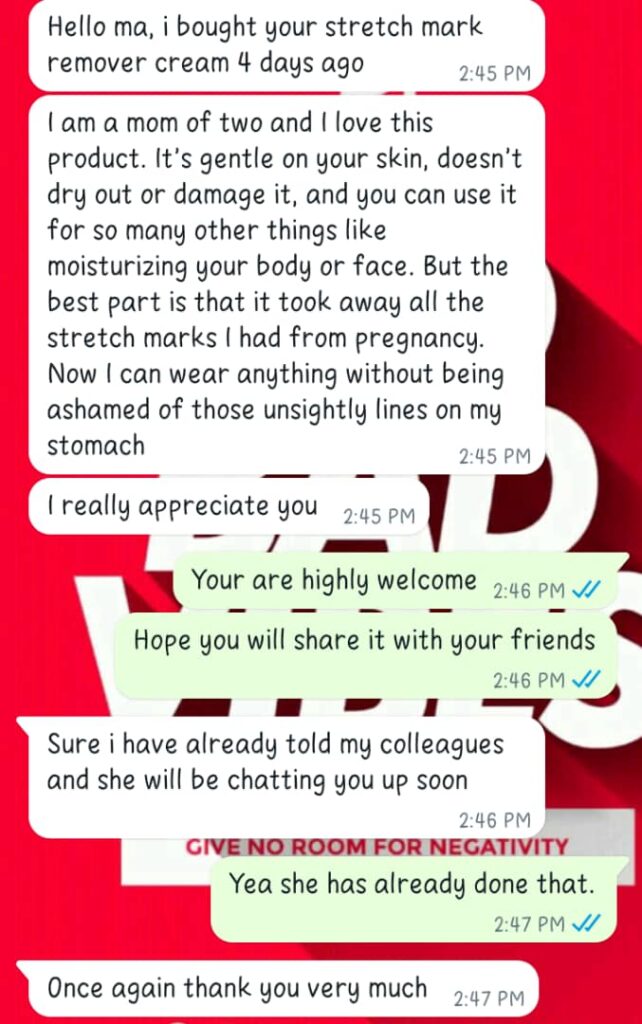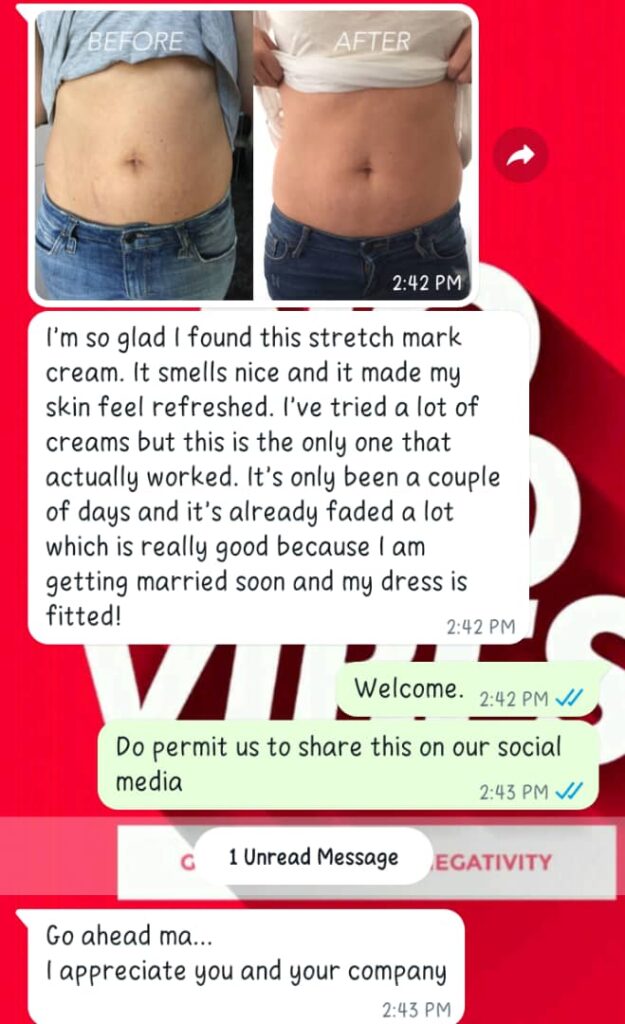 Our Scar and Stretch Mark Remover cream is a professional blend of Natural Ingredients that will eradicate the appearance of scar and stretch marks in Days.