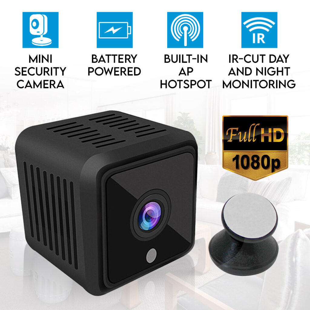 WIRELESS SECURITY CAMERA is a rechargeable security camera that measures less than 1-square inch records in full HD video and is equipped with a powerful microphone to record perfect audio; records 24/7 day or night.